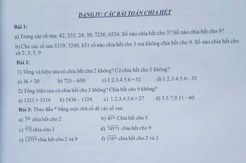 a,số chia hết cho 3 ; 42,255,24,39,7236,6534