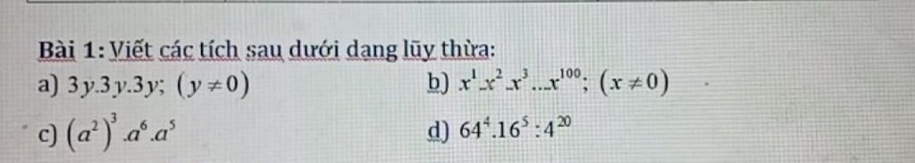 $a)\,3y.3y.3y=3y^3\\b)\,x.x^{\large2}.x^{\large3}.\!.\!.x^{\large100}\\=x^{\large1+2+3\ +...+\ 100}\\=x^{\large\frac{(100+1).100}{2}}\\=x^{5050}\\c)\,(a^2)^3.a^6.a^5\\=a^6.a^6.a^5\\=a^{6+6+5}\\=a^{17}\\d)\,64^4.16^5:4^{20}\\=\left(2^6\right)^4.\left(2^4\right)^5:\left(2^2\right)^{20}\\=2^{24}.2^{20}:2^{40}\\=2^{44}:2^{40}=2^4$