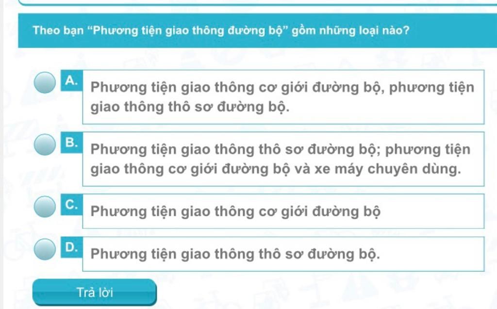 $⇒$ Phương tiện giao thông thô sơ đường bộ gồm: Xe đạp, xe xích lô,....