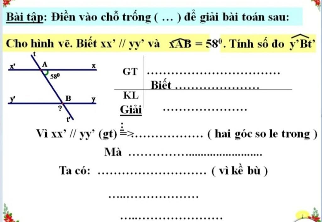 Cho hình vẽ. Biết xx' // yy' và xAB = 58°. Tính số đo y'Bt