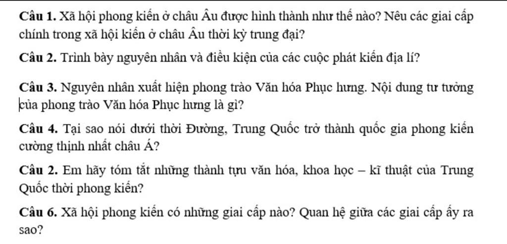 Câu 1. Xã hội phong kiến ở châu Âu được hình thành như thế nào? Nêu các giai cấpchính trong xã hội kiến ở châu Âu thời kỳ trung đại?