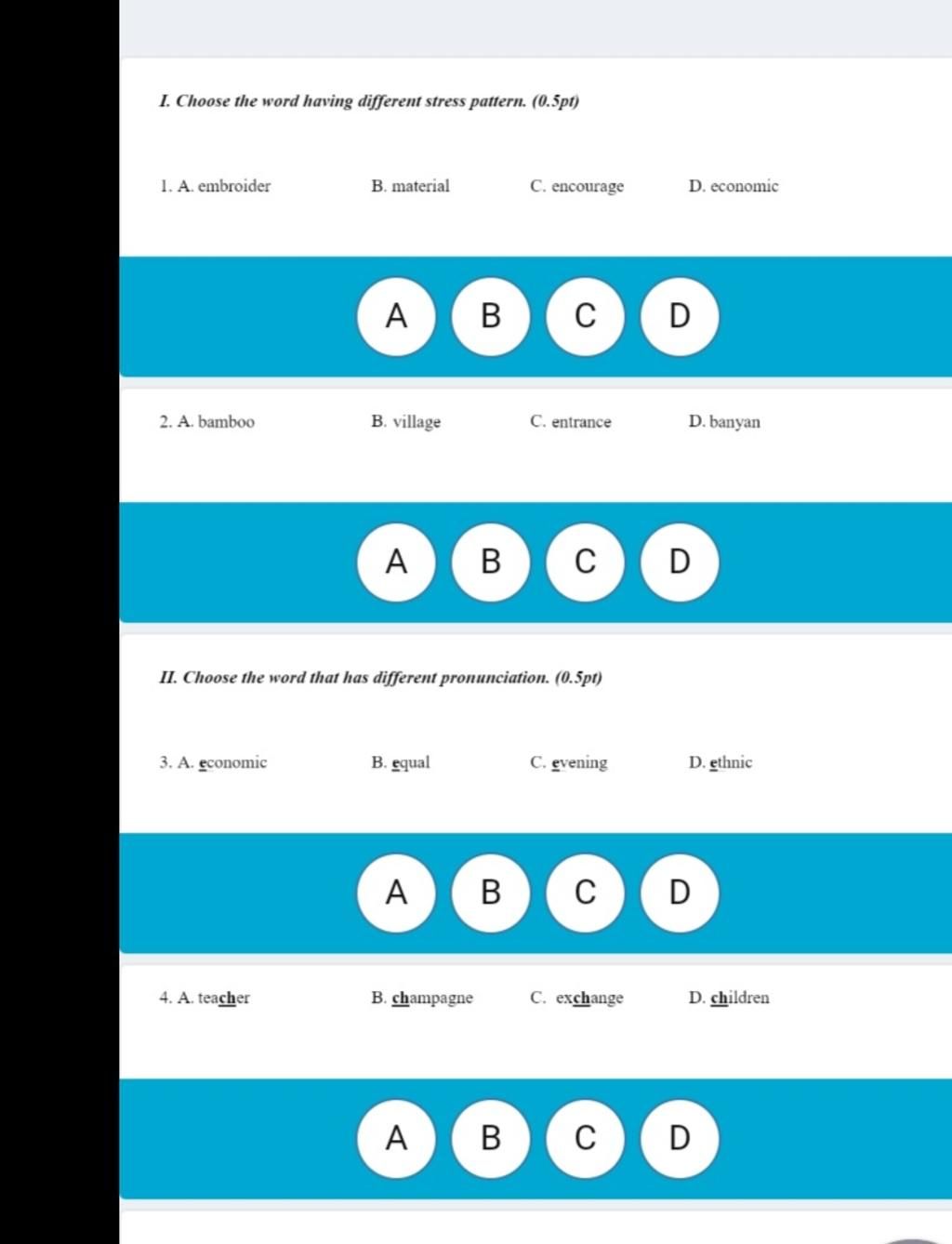 + Phần gạch chân của từ $B$ phát âm /sh/, còn lại là /ch/.