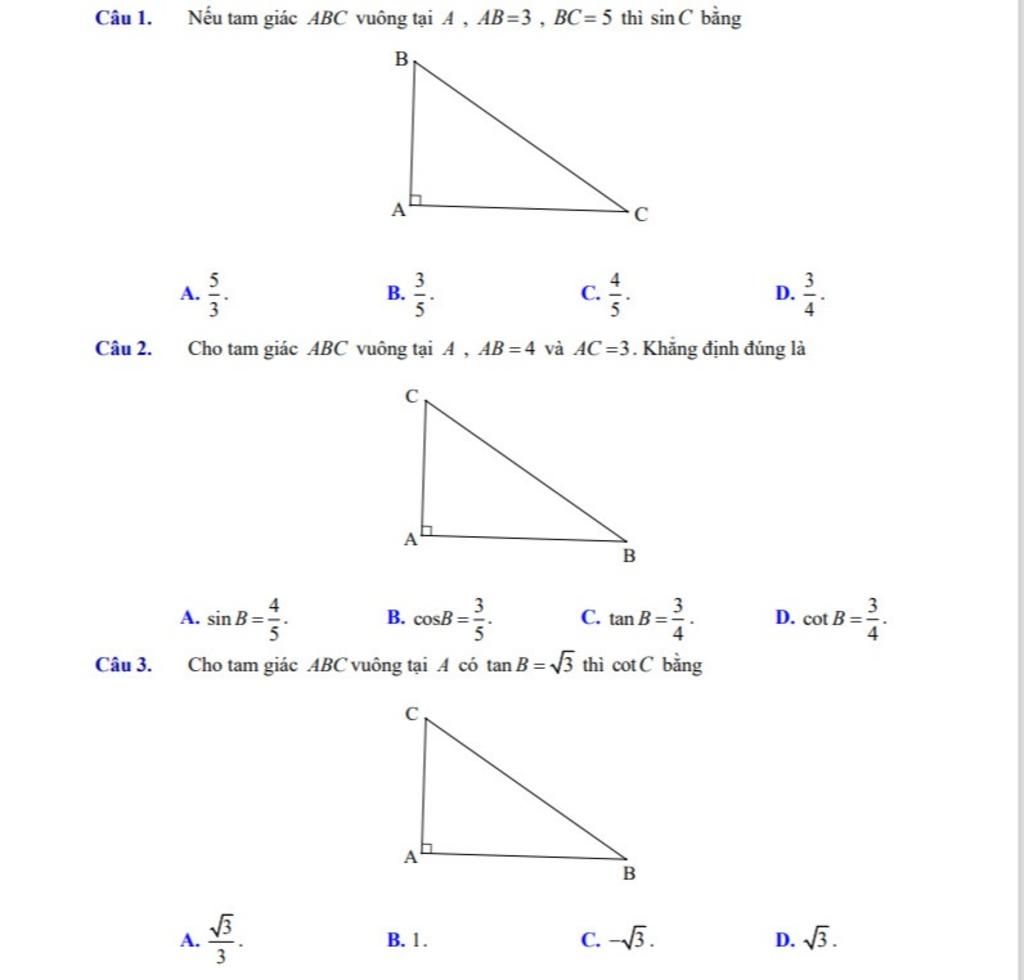Nếu tam giác ABC vuông tại A, AB=3, BC=5 thì sin C bằng
