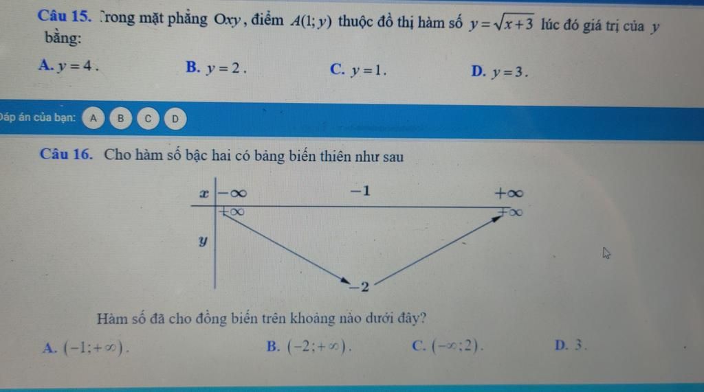 câu 15 thì thay A(1,y) vào Câu 16 là -1đến dương vô cùng và -2 đến dương vô cùng đều tăng nên nó đồng biến