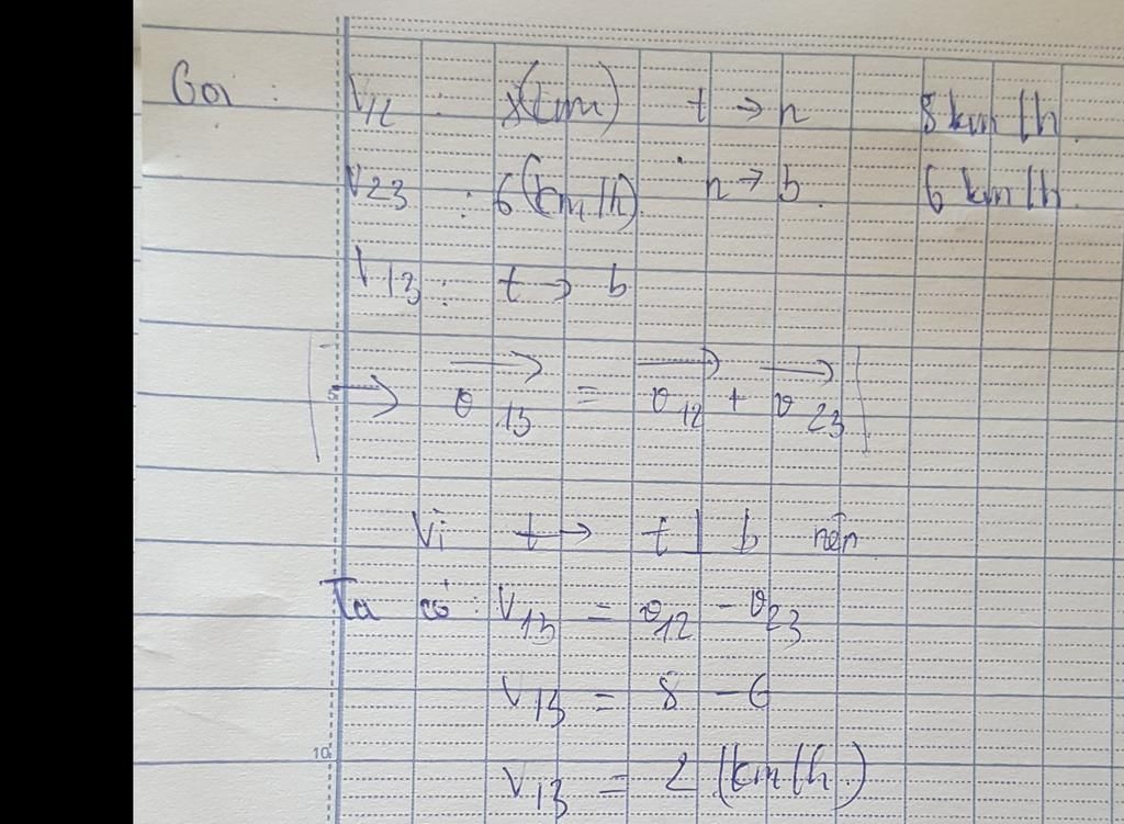 Vận tốc của ca nô so với bồ là:$v' = \sqrt {{v^2} + {u^2}} = \sqrt {{6^2} + {8^2}} = 10km/h$