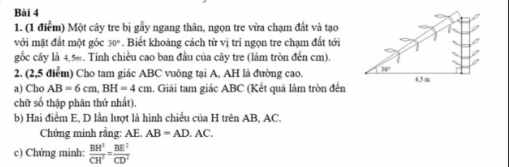 1. (1 điểm) Một cây tre bị gẫy ngang thân, ngọn tre vừa chạm đất và tạo