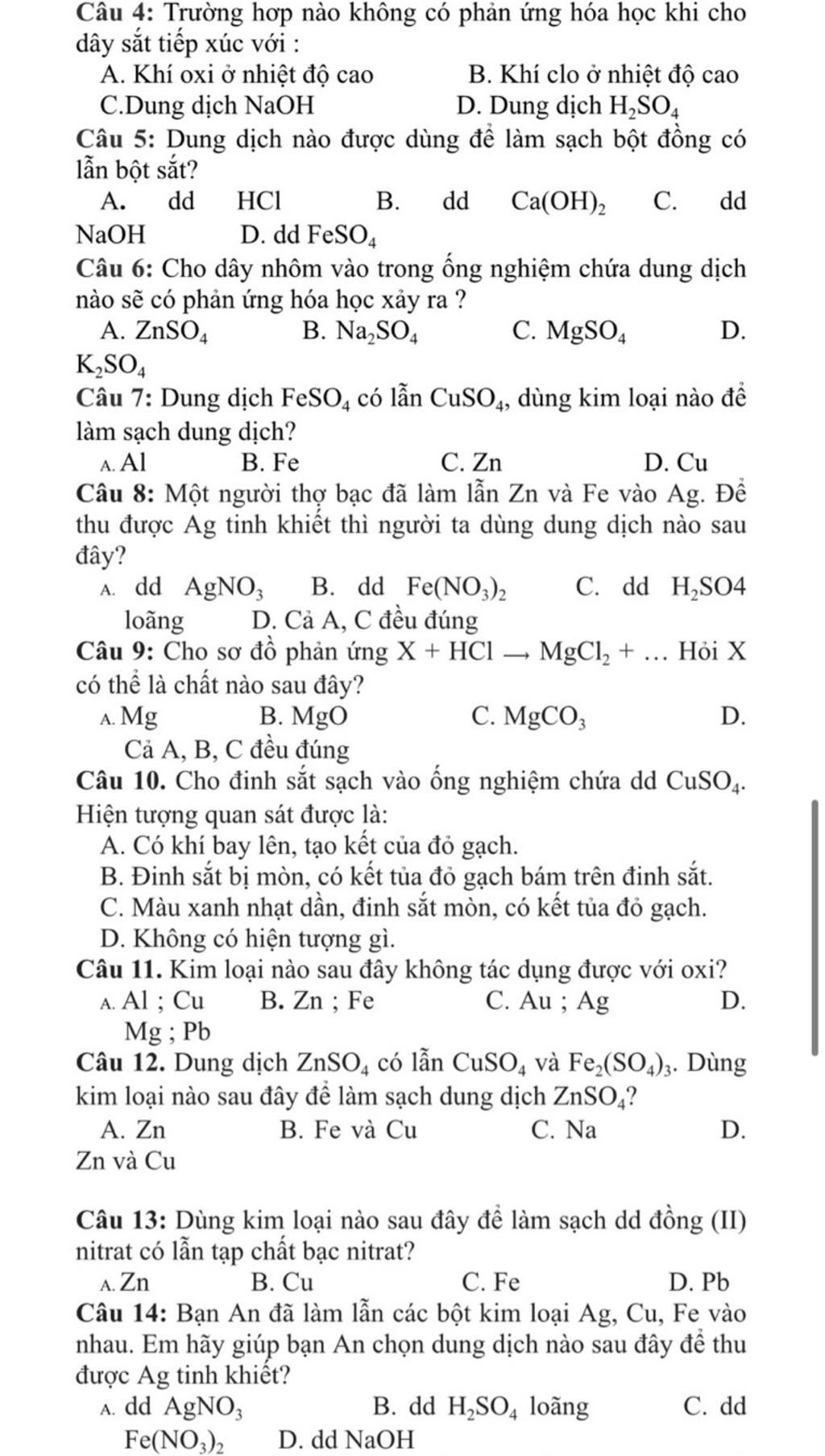 Câu 5: Dung dịch nào được dùng để làm sạch bột đồng có
