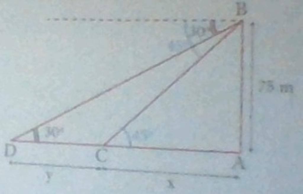 `⇒tan C = (AB)/(AC) = 75/(AC) ⇒ AC = 75/(tan 45^o) = 75` (m)
