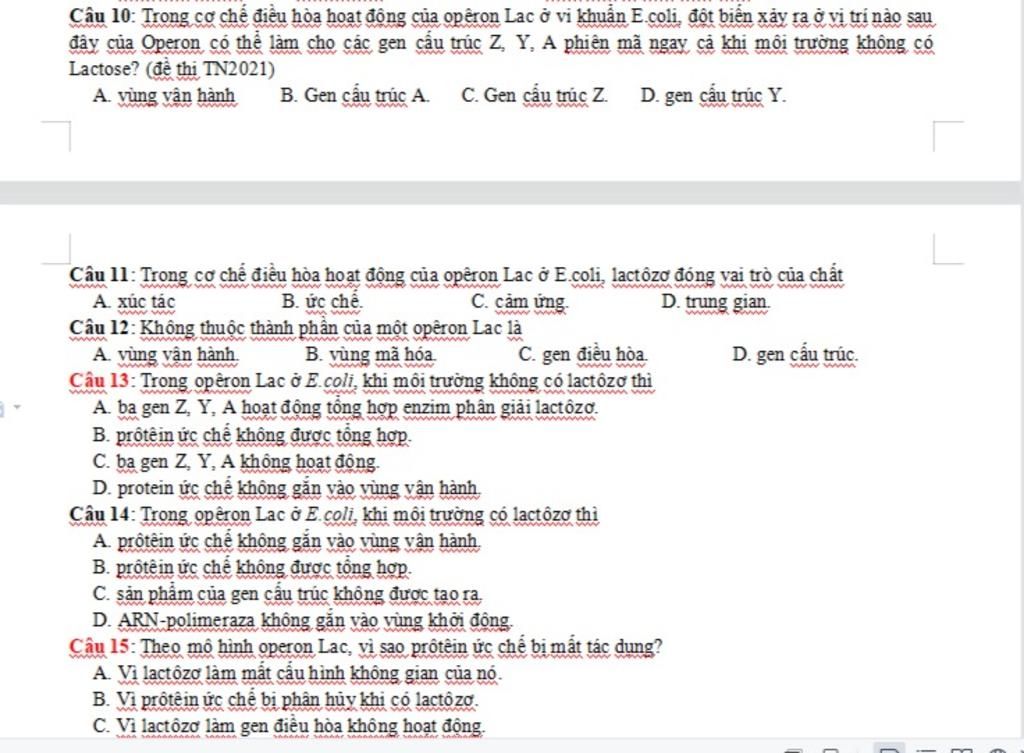 câu 11 lactozo đóng vai trò chất cảm ứng