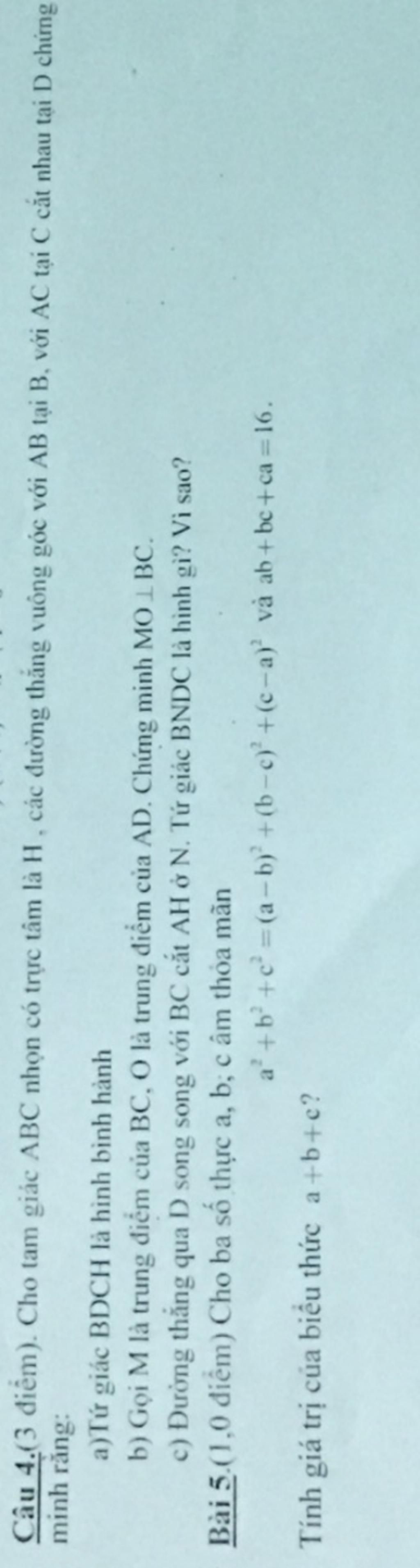 Câu 4.(3 điểm). Cho tam giác ABC nhọn có trực tâm là H, các đường thắng vuông góc với AB tại B, với AC tại C cắt nhau tại D chứng
