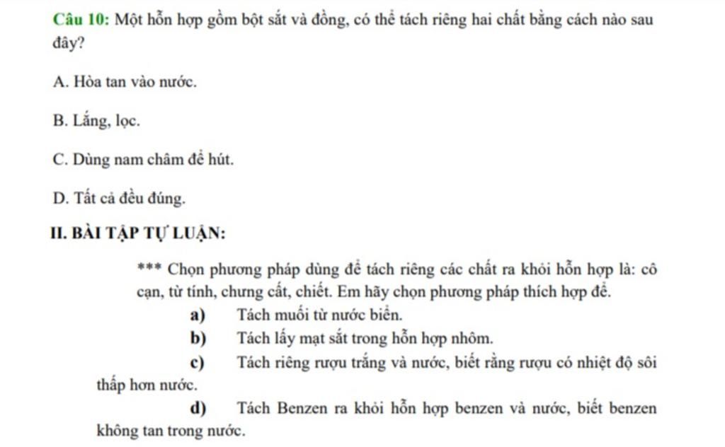 Câu 10: Một hỗn hợp gồm bột sắt và đồng, có thể tách riêng hai chất bằng cách nào sau