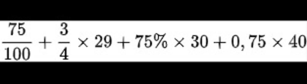 $\dfrac{75}{100}$ + $\dfrac{3}{4}$ × 29 + 75 % × 30 + 0,75 × 40