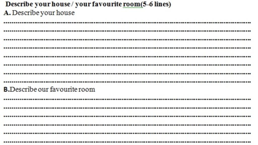 B. There are 5 rooms in my house, bedrooms, 1 kitchen, 1 bathroom, and 1 living room. But I like my bedrooms best. It's look cute with blue walls. There is a beautiful clock and a poster of my idol. I usually study in there with my brother. It's also have a air conditioner and another bathroom. I love my bedroom because I can relax, listen to music and have space to do everything I like. I love my bedroom.