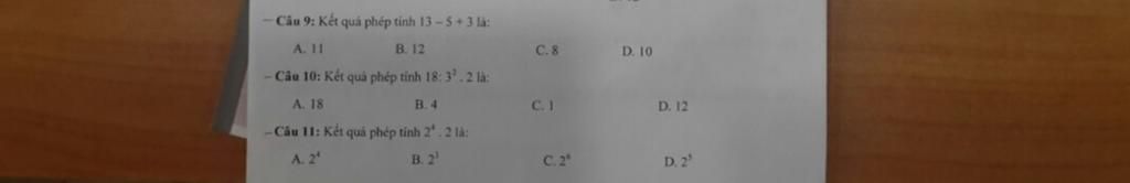 Câu 10: Kết quả phép tính 18 : 3² . 2 là:
