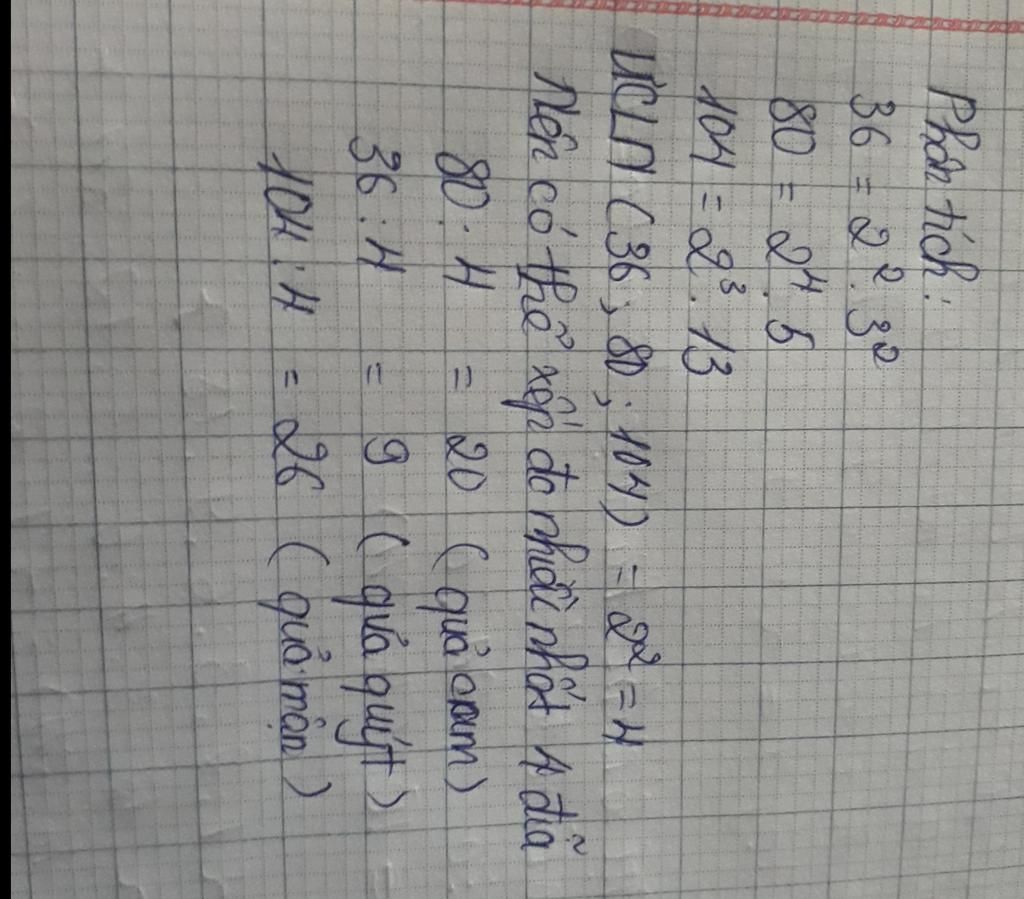 Vì cô Lan phụ trách đội cần chia số trái cây trong đó có 80 quả cam 36 quả quýt và 104 quả mận vào các dĩa bánh kẹo trung thu sao cho số quả mỗi loại trong các dĩa bằng nhau