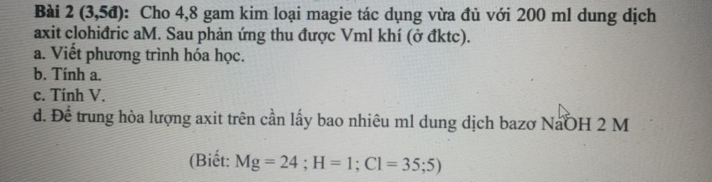\(a,\\PTHH : \ Mg + 2HCl \to MgCl_2 + H_2\\\\b,\\\text{Ta có :} \ n_{HCl}=0,2.2=0,4 \quad \text{(mol)}\\\to a=C_{M_{HCl}}=\dfrac{0,4}{0,2}=2 \quad (M)\\c,\\\text{Ta có :} \ n_{Mg}=\dfrac{4,8}{24}=0,2 \quad \text{(mol)}\\\to n_{H_2}=n_{Mg}=0,2 \quad \text{(mol)}\\\to V=V_{H_2}=0,2.22,4=4,48 \quad \text{(l)}\\c,\\PTHH : \ NaOH + HCl \to NaCl + H_2O\\\text{Theo phương trình :} \ n_{NaOH}=n_{HCl}=0,4 \quad \text{(mol)}\\\to V_{dd \ NaOH}=\dfrac{0,4}{2}=0,2 \ \text{(l)} = 200 \ \text{(ml)}\)