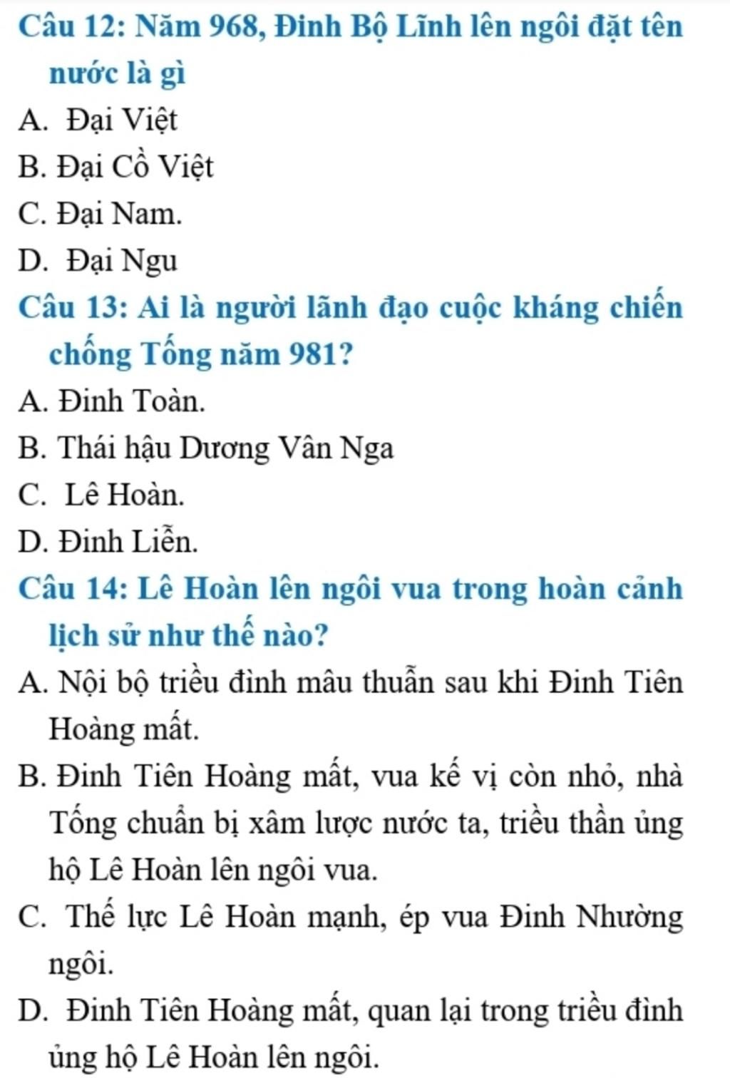 câu 14: Đinh Tiên Hoàng mất, vua kế vị còn nhỏ, nhà Tống chuẩn bị xâm lược ===> Lê Hoàn lên ngôi vua.