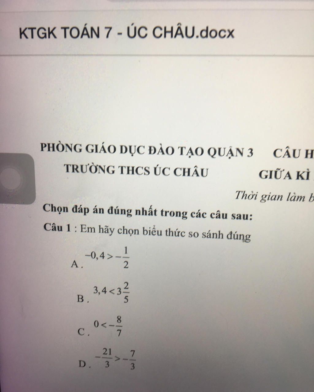 $\displaystyle \begin{array}{{>{\displaystyle}l}} A.\ -0,4 >-\frac{1}{2} \ là\ đúng\ vì\ -0,4 >\ -0,5\\ B.\ 3,4< 3\frac{2}{5} \ là\ sai\ vì\ 3,4=3\frac{2}{5}\\ C.\ 0< \ -\frac{8}{7} \ là\ sai\ vì\ 0 >-\frac{8}{7}\\ D.\ \frac{-21}{3} >-\frac{7}{3} \ là\ sai\ vì\ -21< \ -7\ nên\ \frac{-21}{3} < \frac{-7}{3} \end{array}$