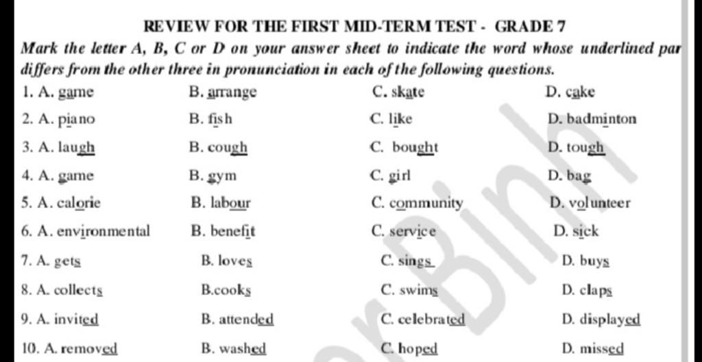 REVIEW FOR THE FIRST MID-TERM TEST - GRADE 7