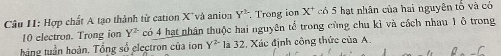 Câu 11: Hợp chất A tạo thành từ cation X*và anion Y2. Trong ion X có 5 hạt nhân của hai nguyên tố và có