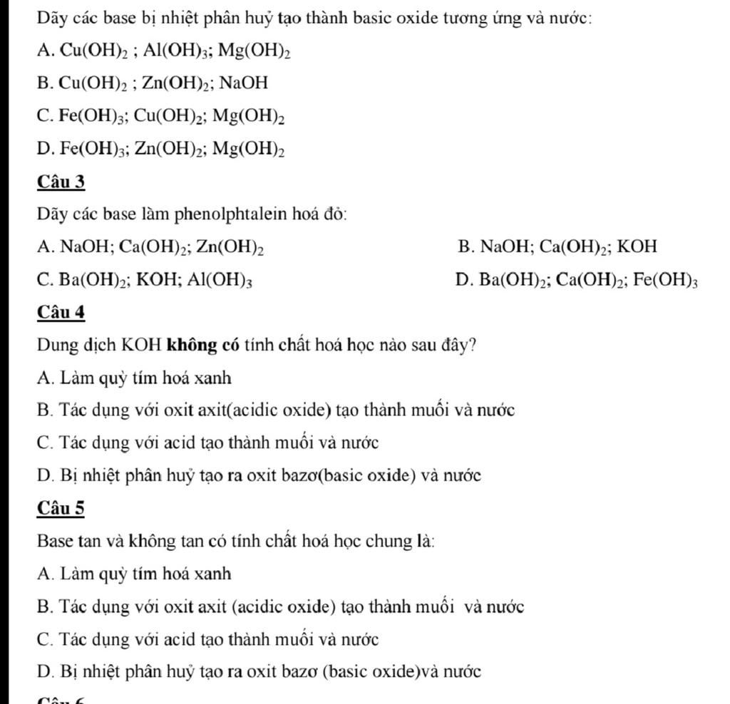 - Vì chỉ có các bazơ không tan mới bị nhiệt phân hủy tạo thành oxit bazơ tương ứng và nước. Mà KOH là bazơ tan nên KOH sẽ không có tính chất trên.