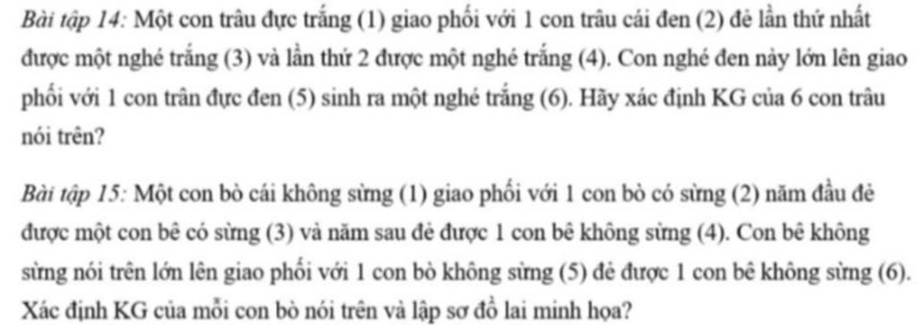 `=>` trâu cái đen có KG Aa, trâu đực trắng có KG aa , nghé trắng lần 1 aa , nghé trắng lần 2 Aa ( kg dị hợp ) , trâu đực đen Aa , nghé trắng có P trâu đực đen và nghé đen là aa .