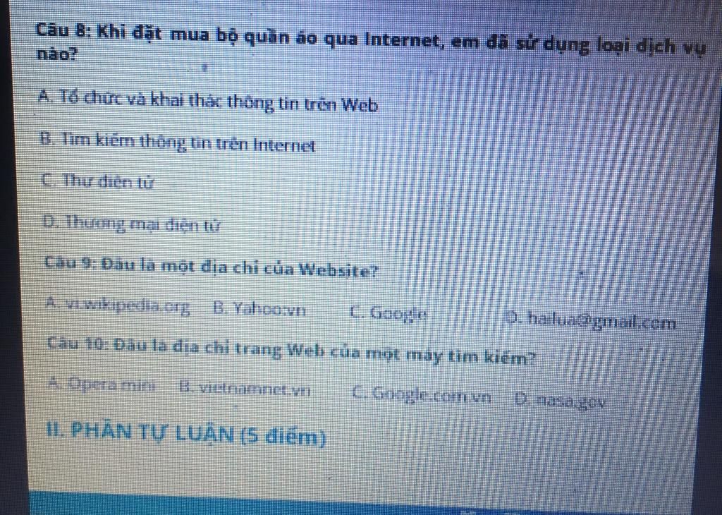 Cầu 8: Khi đặt mua bộ quần áo qua Internet, em då sử dụng loại dịch vụ