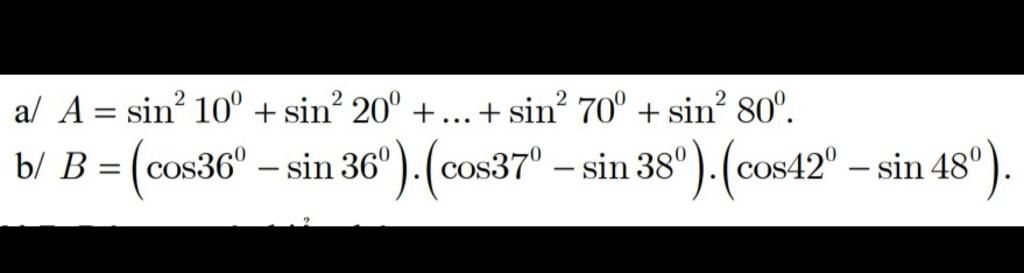 $a)A=\sin^210^\circ+\sin^220^\circ+\sin^230^\circ+\sin^240^\circ+\sin^250^\circ+\sin^260^\circ+\sin^270^\circ+\sin^280^\circ\\ =\sin^210^\circ+\sin^220^\circ+\sin^230^\circ+\sin^240^\circ+\cos^2(90^\circ-50^\circ)+\cos^2(90^\circ-60^\circ)+\cos^2(90^\circ-70^\circ)+\cos^2(90^\circ-80^\circ)\\ =\sin^210^\circ+\sin^220^\circ+\sin^230^\circ+\sin^240^\circ+\cos^240^\circ+\cos^230^\circ+\cos^220^\circ+\cos^10^\circ\\ =(\sin^210^\circ+\cos^210^\circ)+(\sin^220^\circ+\cos^220^\circ)+(\sin^230^\circ+\cos^230^\circ)+(\sin^240^\circ+\cos^240^\circ)\\ =1+1+1+1\\ =4\\ b)B=(\cos 36^\circ-\sin 36^\circ)(\cos 37^\circ-\sin 38^\circ)(\cos 42^\circ-\sin 48^\circ)\\ =(\cos 36^\circ-\sin 36^\circ)(\cos 37^\circ-\sin 38^\circ)(\cos 42^\circ-\cos(90^\circ- 48^\circ))\\ =(\cos 36^\circ-\sin 36^\circ)(\cos 37^\circ-\sin 38^\circ)(\cos 42^\circ-\cos 42^\circ)\\ =(\cos 36^\circ-\sin 36^\circ)(\cos 37^\circ-\sin 38^\circ).0\\ =0.$