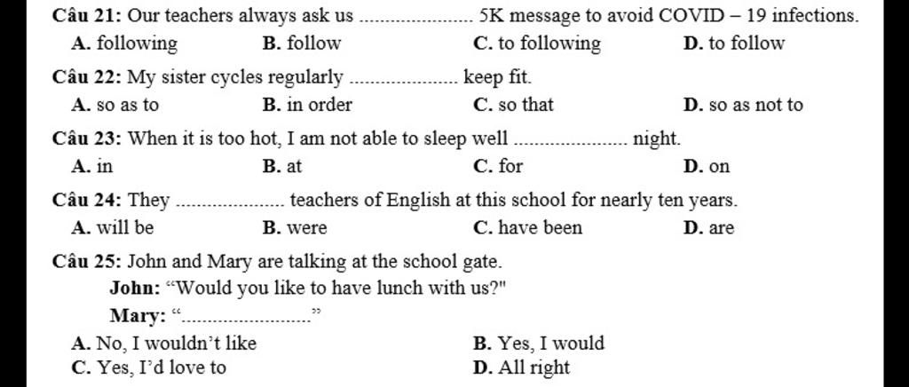 `->` Loại câu B vì in order+to+V : để làm gì (Câu trả lời thiếu to)