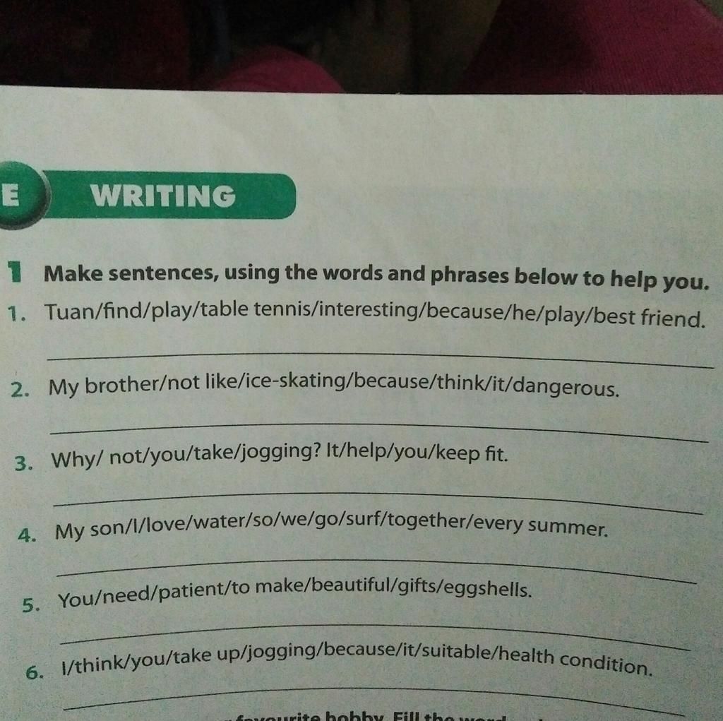 1. Tuan / find / play / table tennis / interesting / because / he / play / best friend. => Tuan find playing table tennis interesting because he plays with his best friend.