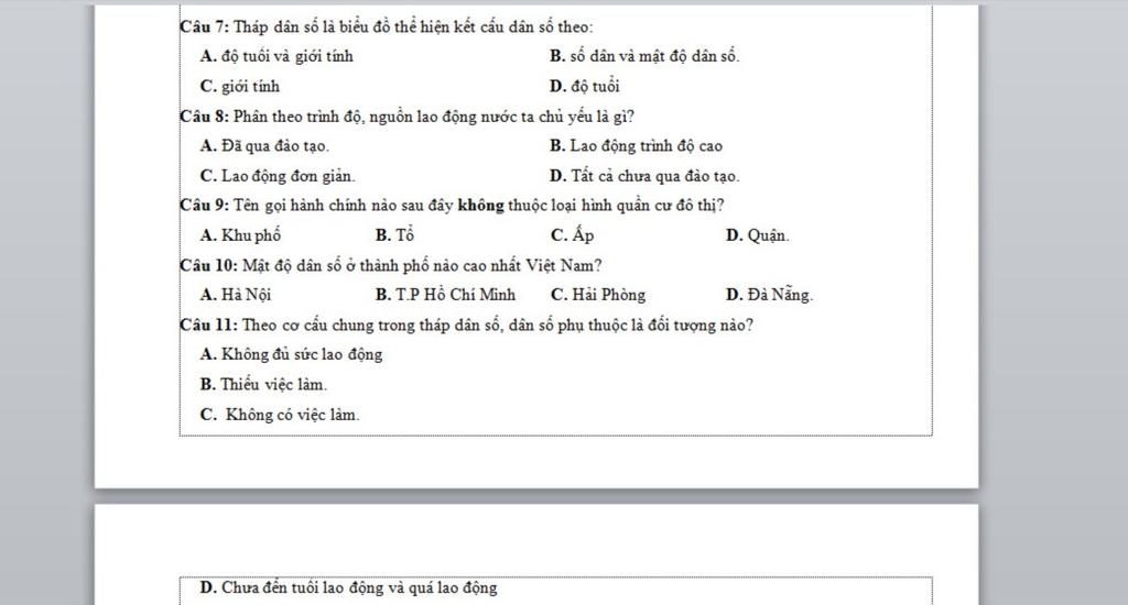 Câu 7: Tháp dân số là biểu đồ thể hiện kết cấu dân số theo: