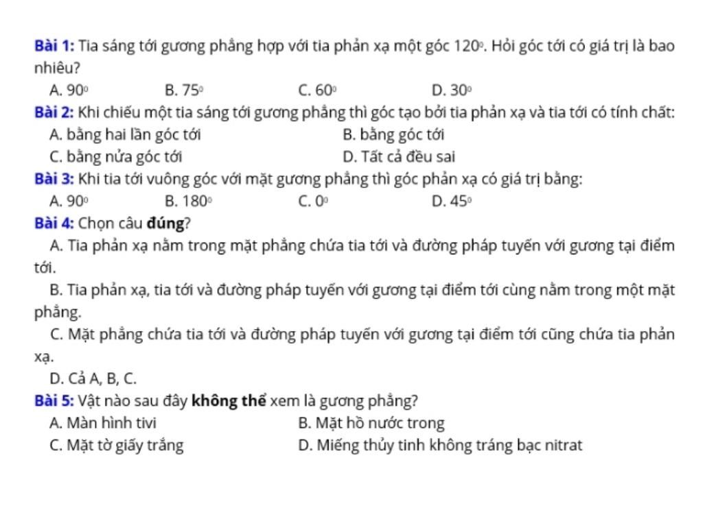 Câu 3 : Khi vuông góc với mặt gương thì góc phản xạ có giá trị bằng 90 độ