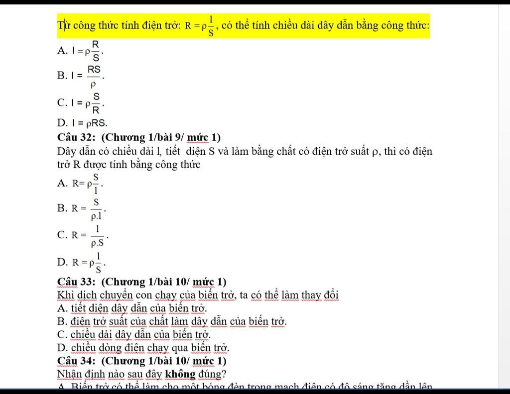 Điện trở là: \(R = \rho \dfrac{l}{S}\)