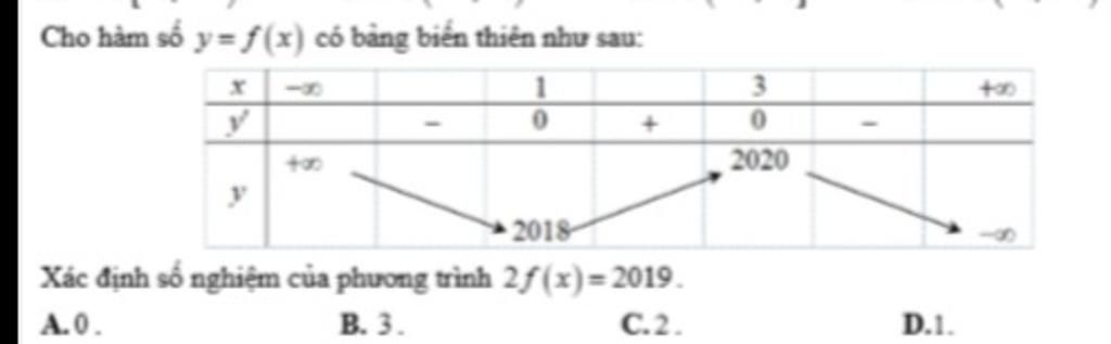 Vì $\dfrac{2019}2<2018$ nên từ bảng biến thiên suy ra phương trình $2f(x)=2019$ có duy nhất $1$ nghiệm