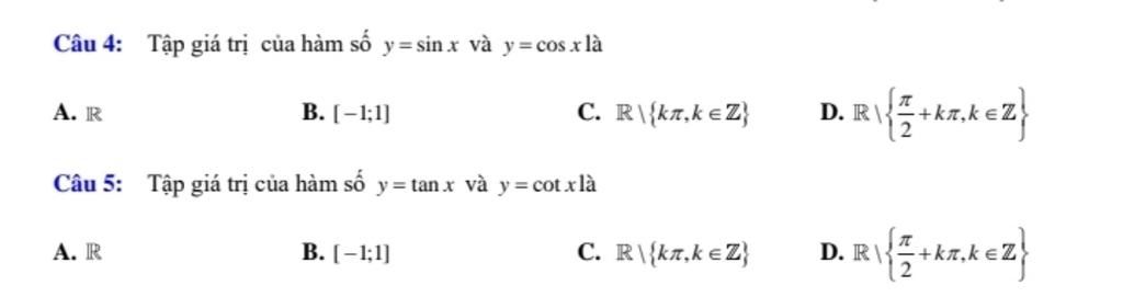Câu 4: Tập giá trị của hàm số y= sin x và y= cos x là