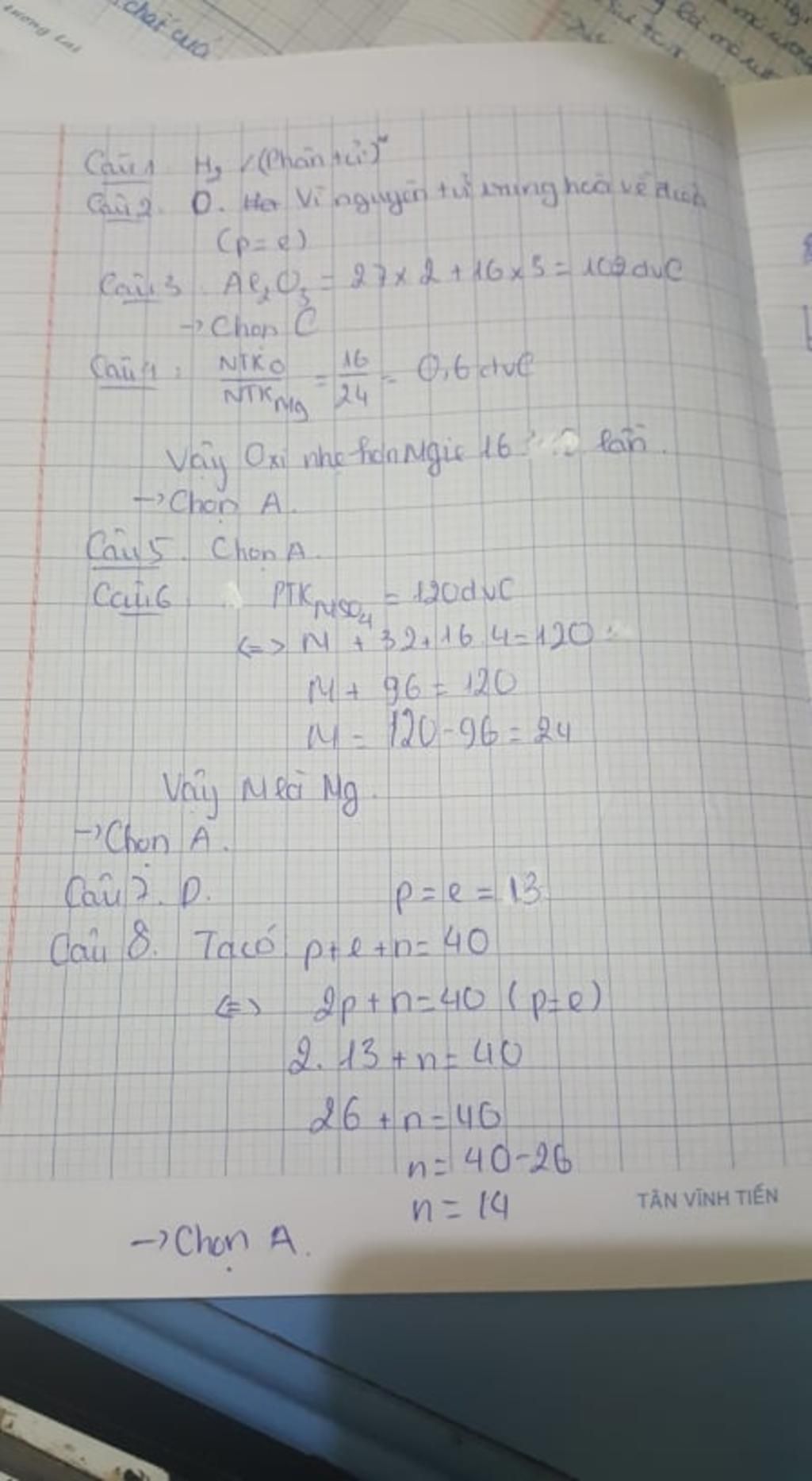 Câu 8: Trong một nguyên tử có tổng số các hạt p, n, e là 40, trong đó số proton là 13 thì: