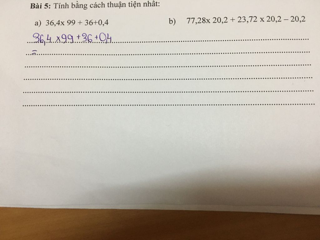 A, 36,4 x 99 + 36 + 0,4 = 36,4 x 99 + 36,4 = 36,4 x ( 99 + 1 ) = 36,4 x 100 =3640
