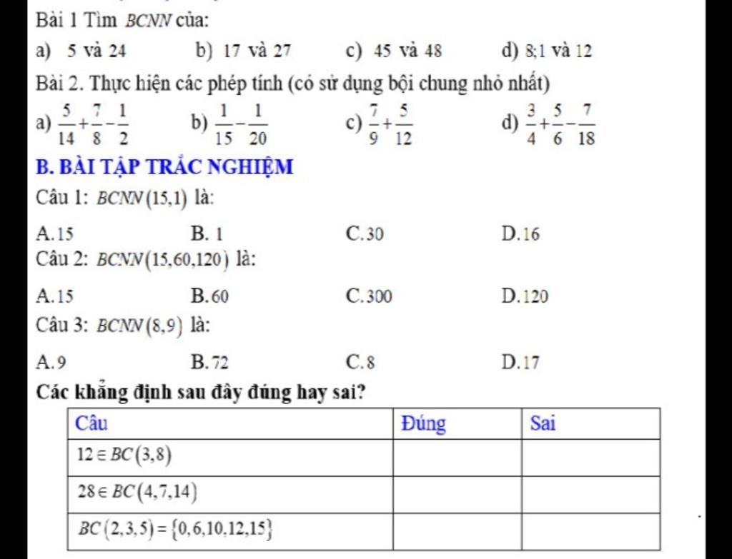 Bài 2. Thực hiện các phép tính (có sử dụng bội chung nhỏ nhất)