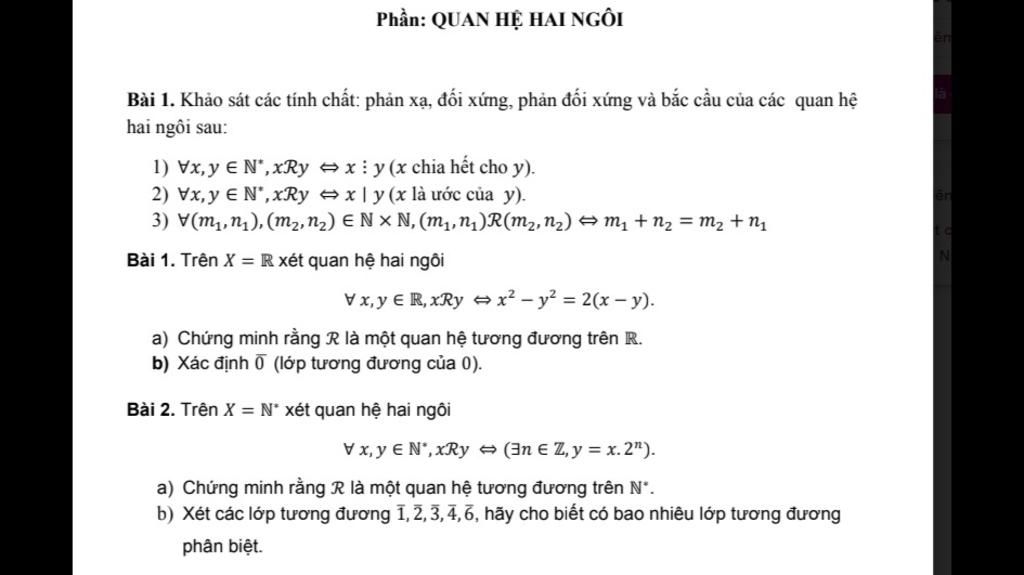 Bài 1. Khảo sát các tính chất: phản xạ, đối xứng, phản đối xứng và bắc cầu của các quan hệ