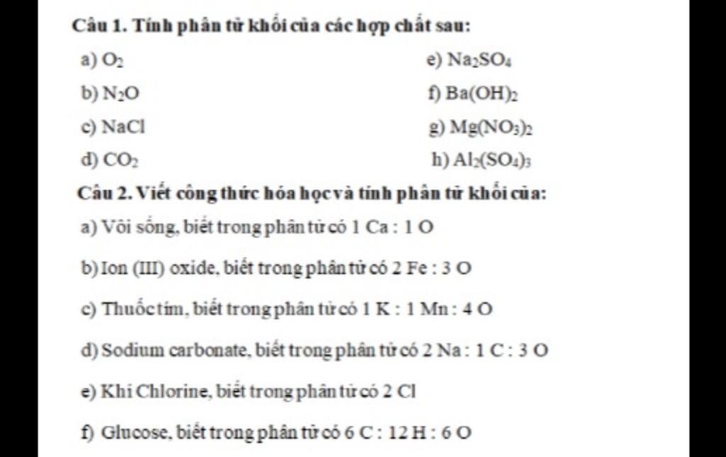 c)KMnO4=39+55+16x3=142 đvC f)C6H12O6=12x6+1x12+16x6=180đvC