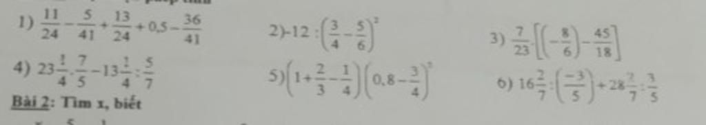 `a) 11/24 - 5/41 + 13/24 + 0,5 - 36/41`$\\$ `= 331/984 + 13/24 + (-31)/82= 36/41 + (-31)/82=1/2`$\\$ `b) -12 : (3/4 - 5/6)^2= -12 : 1/144= -1728`$\\$ `c) 7/23 . [(-8/6) - 45/18 ] = 7/23 . (-23)/6= -7/6`$\\$ `d) 23 1/4 . 7/5 - 13 1/4 : 5/7 = 93/4 . 7/5 - 53/4 . 7/5`$\\$ `= 7/5 . ( 93/4 - 53/4 ) = 7/5 . 10 = 14`$\\$ `e) ( 1 + 2/3 - 1/4 )( 0,8 - 3/4 )^2= 17/12 . (1/20)^2 = 17/4800`$\\$ `g) 16 2/7 : ((-3)/5) + 28 2/7 : 3/5= (-114)/7 : 3/5 + 198/7 : 3/5`$\\$ `= ( (-114)/7 + 198/7 ) : 3/5= 12 : 3/5 = 20`$\\$
