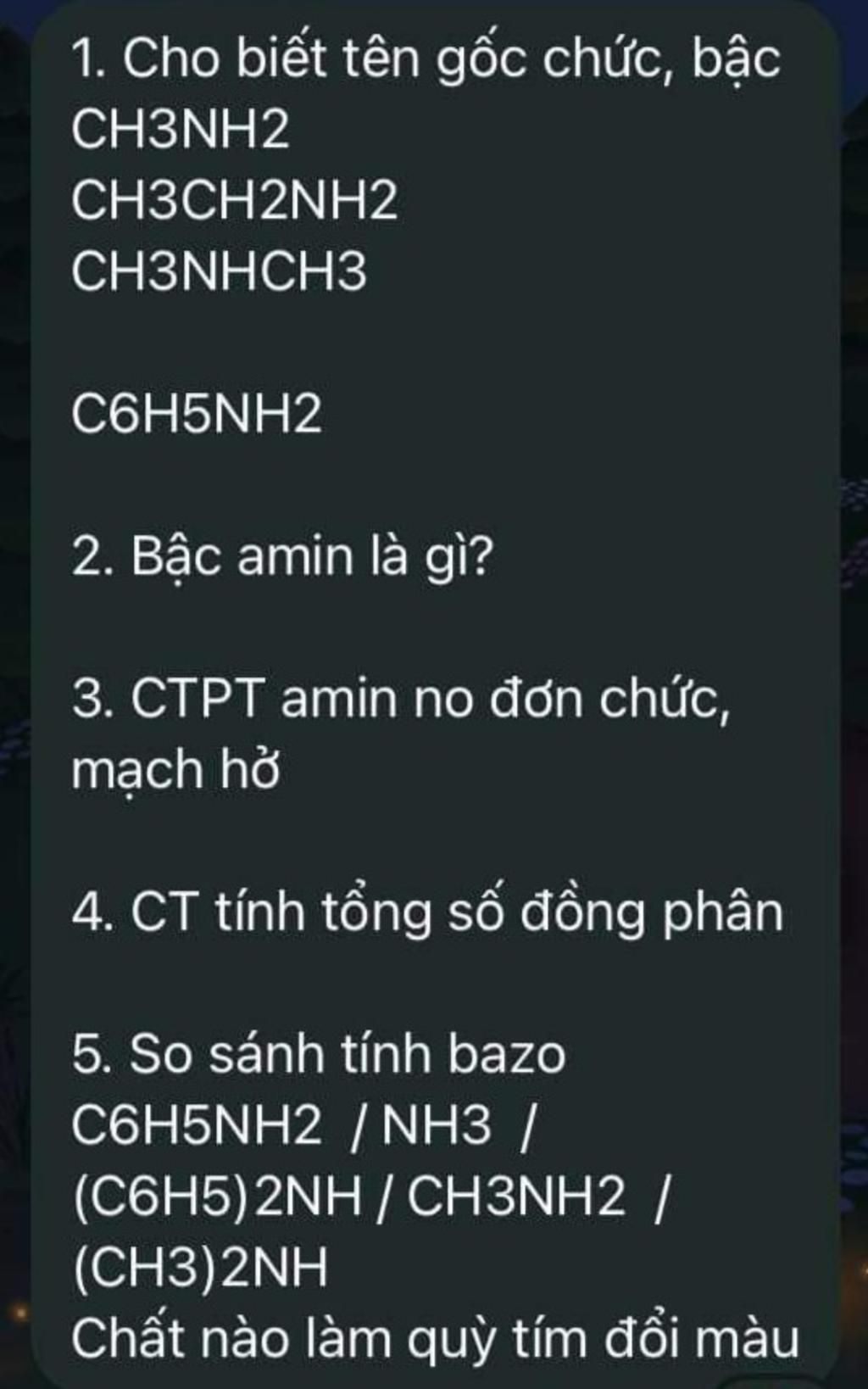 CH3NH2:metylamin(bậc 1), CH3CH2NH2:etylamin(bậc 1) , CH3NHCH3:đimetylamin(bậc 2),C6H5NH2:Anilin(bậc 1)