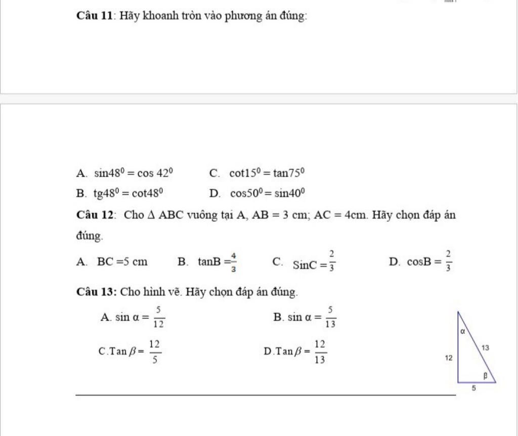 Câu 12: Cho A ABC vuông tại A, AB = 3 cm; AC = 4cm. Hãy chọn đáp án