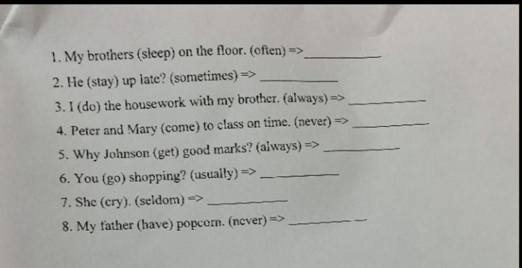 1. My brothers often sleep on the floor. 2. Does he sometimes stay up late?/ Does he stay up late sometimes? 3. I always do the housework with my brother. 4. Peter and Mary never come to class on time. 5. Why does Johnson always get good marks? 6. Do you usually go shopping? 7. She seldom cries. 8. My father never has popcorn. Rút gọn1. My brothers often sleep on the floor. 2. Does he sometimes stay up late?/ Does he stay up late sometimes? 3. I always do the housework with my brother. 4. Peter and Mary never come to class on time. 5. Why does Johnson always get good marks? 6. Do y... xem thêm