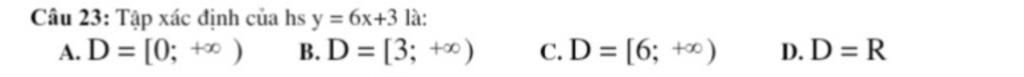 Để biểu thức có tập xác định thì biểu thức đó phải ở dưới căn hoặc là mẫu của phân số nhưng ở đây biểu thức y = 6x + 3 đều không nằm trong hai trường hợp trên nên biểu thức thỏa mãn với mọi x thuộc tập hợp số thực