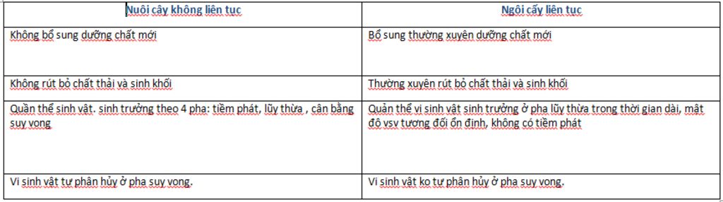 +Nuôi cấy ko liên tục: Không bổ sung thêm chất dinh dưỡng mới và cũng không thu sinh khối hay lấy đi các chất thải độc hại.Đường cong sinh trưởng gồm 4 pha : pha tiềm phát, pha luỹ thừa, pha cân bằng và pha suy vong- Pha luỹ thừa và pha cân bằng bị giới hạn thời gian