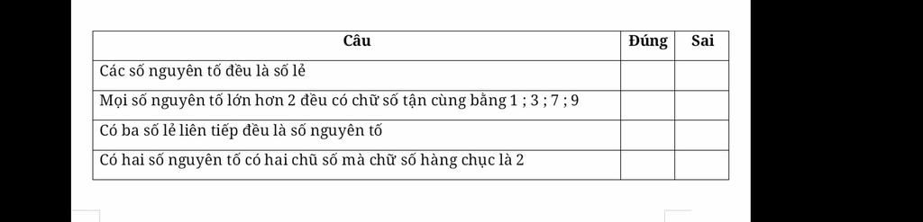 c) Có ba số lẻ liên tiếp đều là số nguyên tố : Đúng