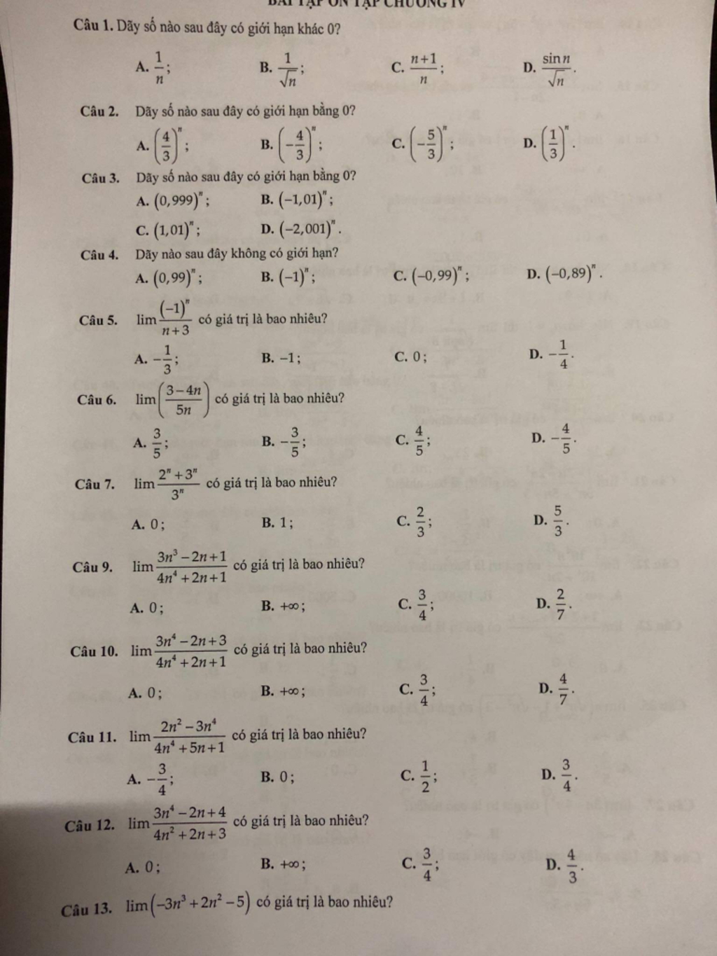 Câu 3. Dãy số nào sau đây có giới hạn bằng 0?