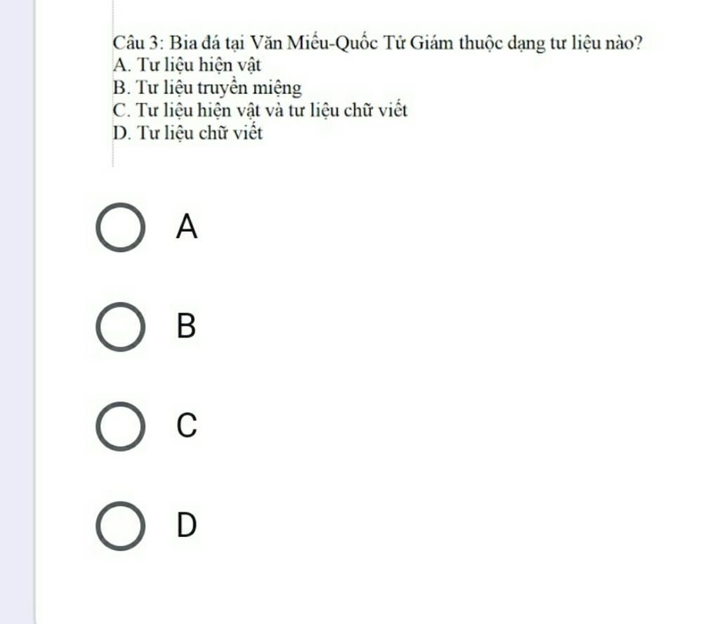 Câu 3: C.Tư liệu hiện vật và tư liệu chữ viết.