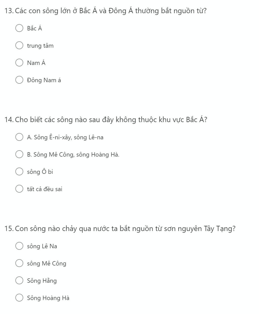 2)-Cho biết các con sông nào dưới đây không thuộc khu vực Bắc Á